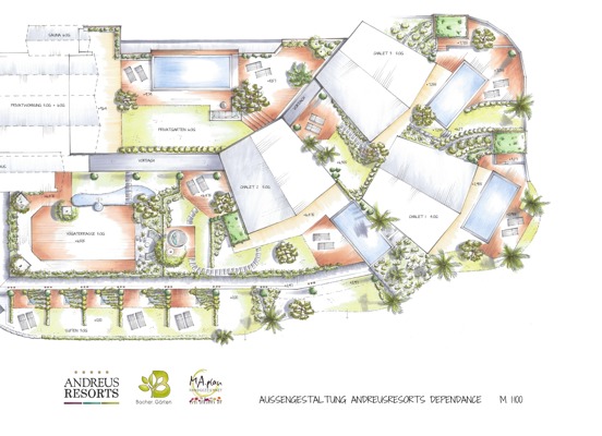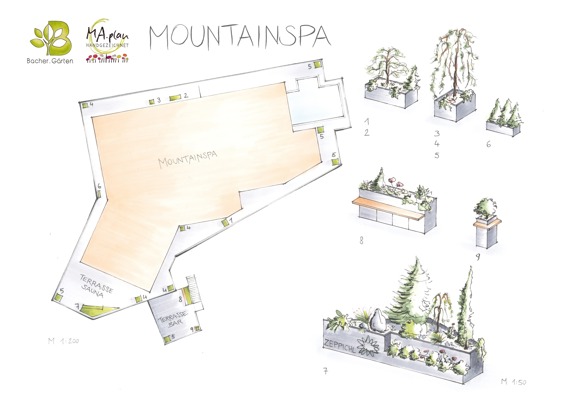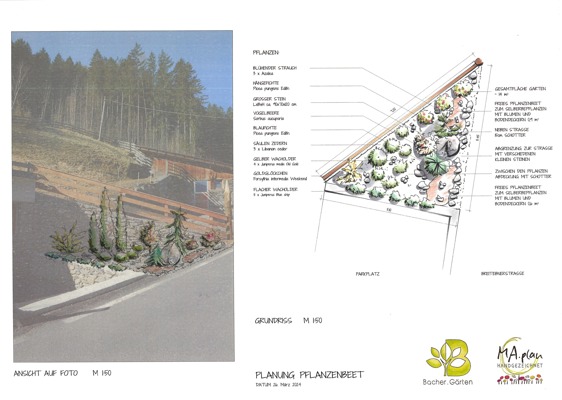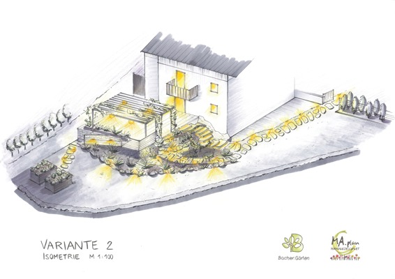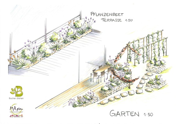 MA.plan ist ein enger Geschäftspartner des Garten- & Landschaftsbauunternehmens Bacher, des Bacher Hans und ist für die Planung von Garten- und Freiflächengestaltungen, welche vom Unternehmen Bacher realisiert werden, zuständig. Dabei werden Lokalaugenscheine, Aufmaße, Kundengespräche und Baustellenabwicklungen in enger Zusammenarbeit und Absprache abgewickelt. MA.plan erstellt die handgezeichneten Visualisierungen von Gartensituationen in 2D und 3D, Illustrationen von Gartenplänen sowie Layouts für die Präsentation beim Kunden.