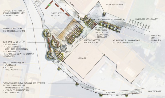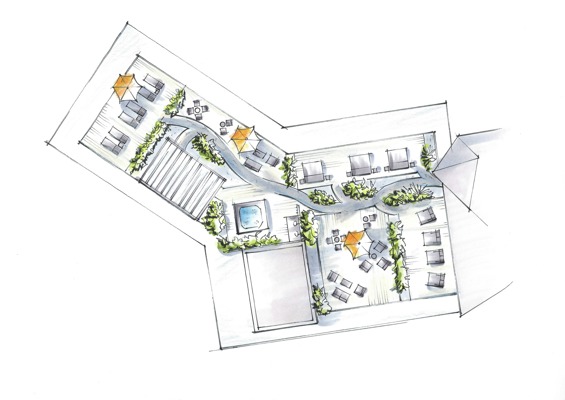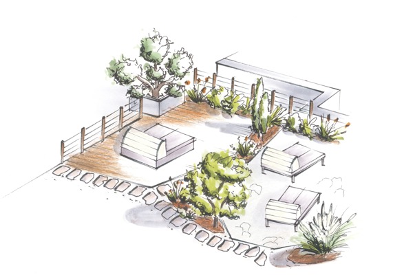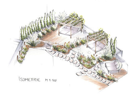 - darauf basierend erstellen wir den finalen Entwurf der Visualisierung durch handgezeichnete Pläne. Auf Wunsch können dies neben Grundrissen auch 3D Ansichten und Detailzeichnungen und eine Pflanzenliste sein.